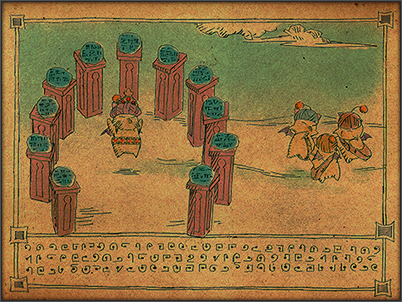 ‘Tis a tale of countless generations past—of joy, of sadness, and one magnificent moogle monarch's unrealized dream. Our story begins in the ancient kingdom of Kupalika, a peaceful and prosperous nation where ten thousand score of moogles and some twice as many sheep lived together in moogle magic-enhanced harmony. This magnificent moogle monarchy reached the peak of its prosperity during the reign of its seventh ruler, King Kupofried the Great, a peerless paragon of a potentate whose wisdom, benevolence, and mastery of magic have yet to see their equal. Verily, it was the selfsame King Kupofried who developed the teleportation techniques of which you adventurers are so fond, kupo. And so the golden age of our ancestors' kingdom endured... Yet time and tide wait for no moogle—not even the mighty King Kupofried. Having grown old and gray, and knowing his time was near, the sagacious sovereign set about his life's work—eleven poems of happiness and joy, engraved on tablets of stone, that could be entrusted to future generations to ensure everlasting peace and prosperity for his children, his grandchildren, and all of mooglekind. |