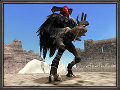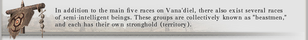 These winged beastmen are found mainly in the Valdeaunia Region. It is said that their damage-absorbing outer shell was once armor that was enhanced by an evil enchantment. In addition to their highly advanced fighting skills, they are also known to possess high levels of intelligence, which they have used to acquire various types of potent magic. Due to their pitch-black color and ominous appearance, the inhabitants of Vana'diel came to call these beastmen "Demons." However, Demons refer to themselves as "the Kindred." This, along with many other questions about their origins, still remain unanswered.