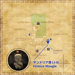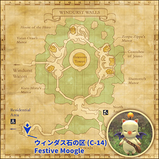 1キャラクターにつき1回、開催期間内のログイン時に自動でマイバッグに「モグチケット【赤】」と「モグチケット【盟】」が配布されます。「モグチケット【赤】」と「モグチケット【盟】」は、以下の場所のNPC“Festive Moogle”にトレードすると、対象のアイテムと交換できます。