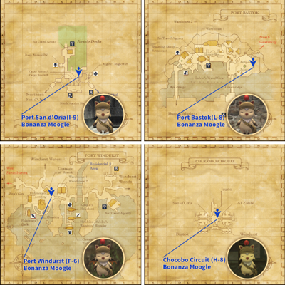 To claim your prize, trade the Bonanza pearl inscribed with your three-digit number to a Bonanza Moogle in one of the areas listed below.