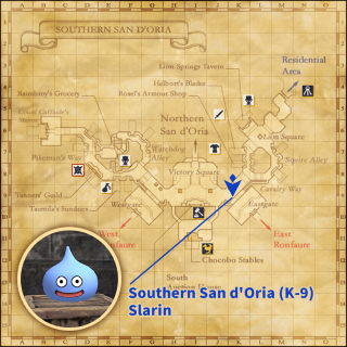 Slarin in Southern San d'Oria (K-9) / Sludge in Bastok Markets (E-10) / Ultra Slime in Windurst Woods (H-11)